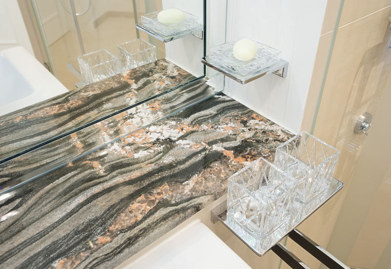 Der Bauherr hat für seinen Wellnessbereich das Material Verde Abrolhos gewählt. Die Verkleidung des Whirlpools besticht dadurch, dass die Struktur des einzigartigen Materials auch in der Rundung erhalten bleibt. Das Material wiederholt sich in der Dusche, den Ablagen wie auch in den Abschlussleisten.